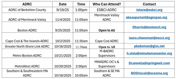 By Chantal JohnsonPosted on October 14, 2025Posted in Announcements, Job Aids & Training, OC Program Information Upcoming Regional ADRC Meetings Post navigation Options Counseling OutletCaregiver Corner Leave a Reply Cancel replyYour email address will not be published. Required fields are marked *Comment * Name * Email * Website Save my name, email, and website in this browser for the next time I comment.